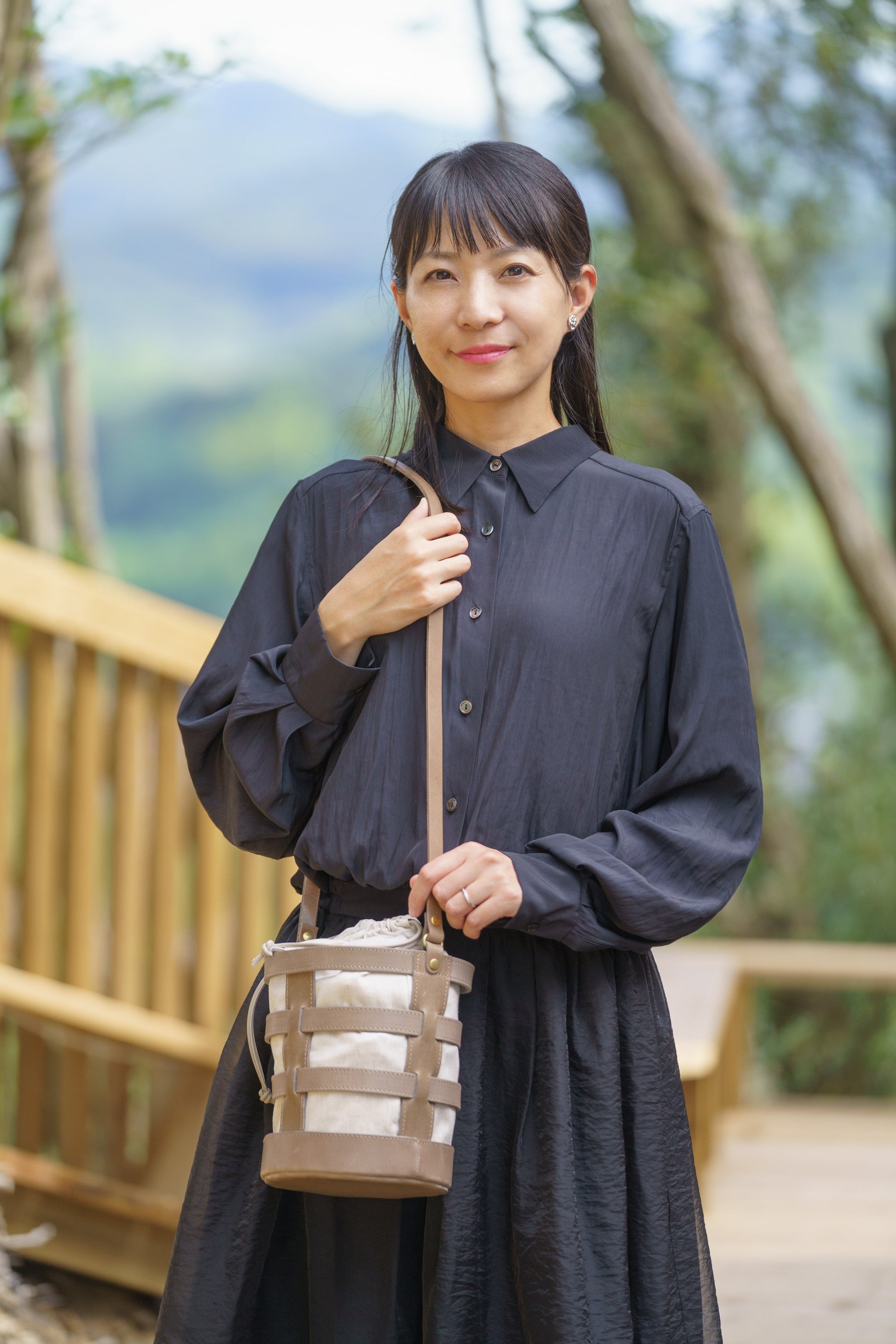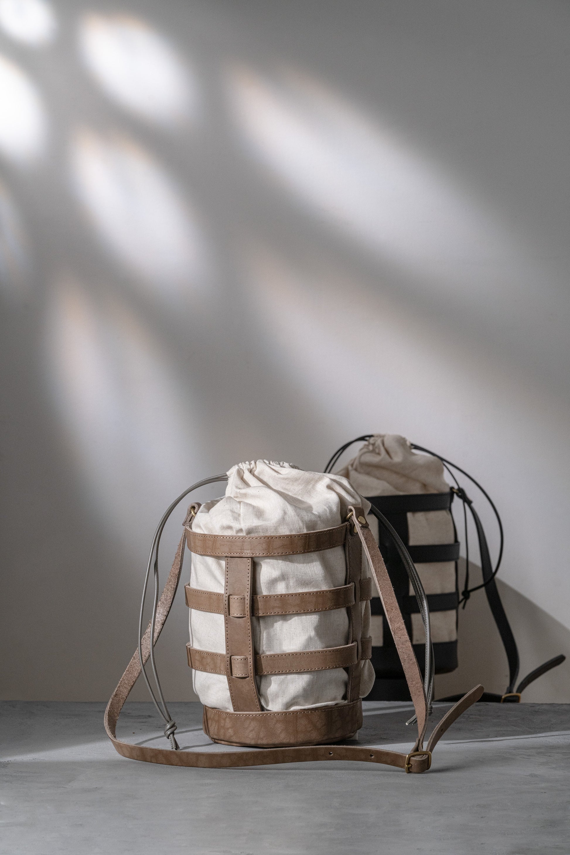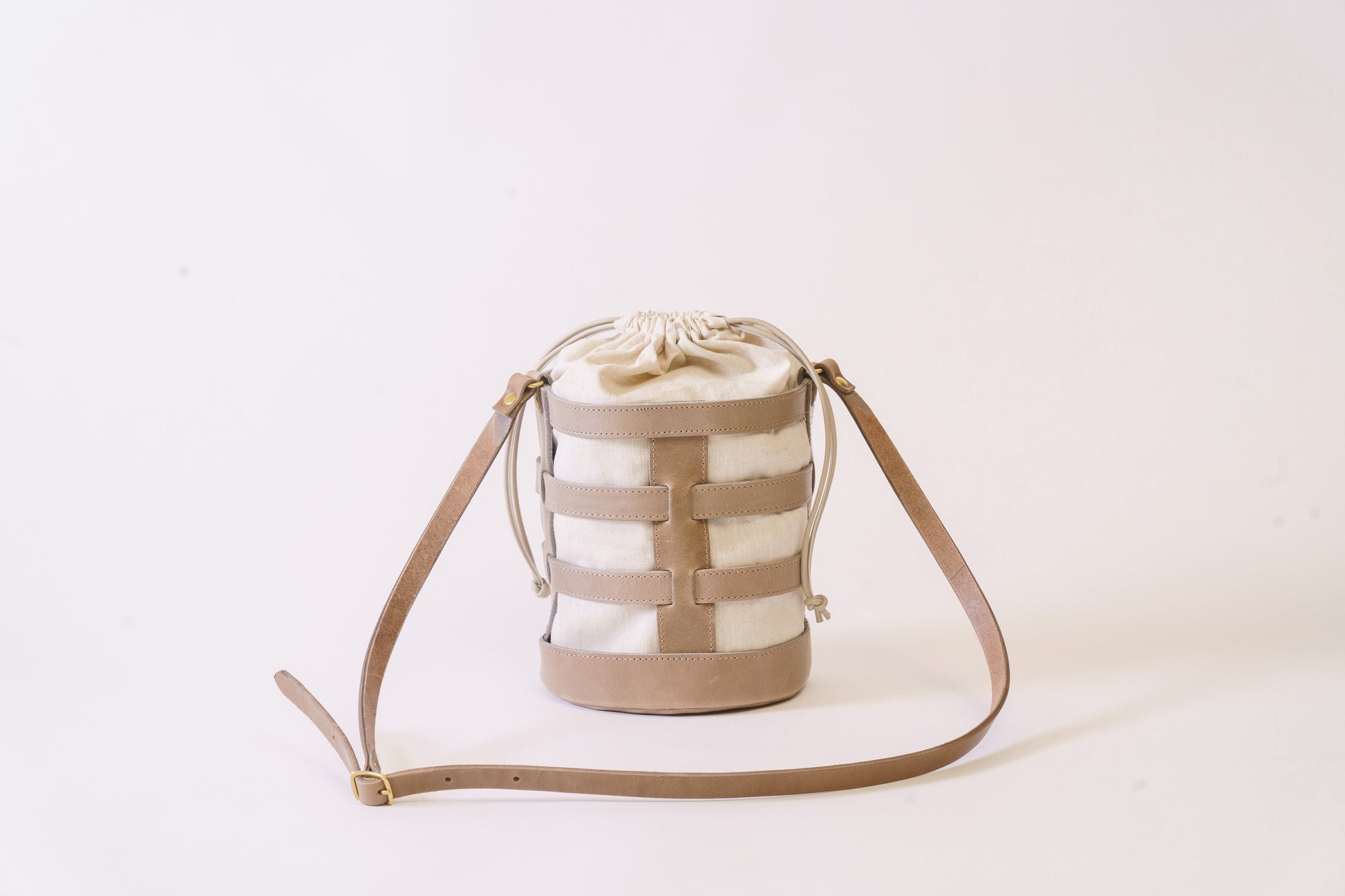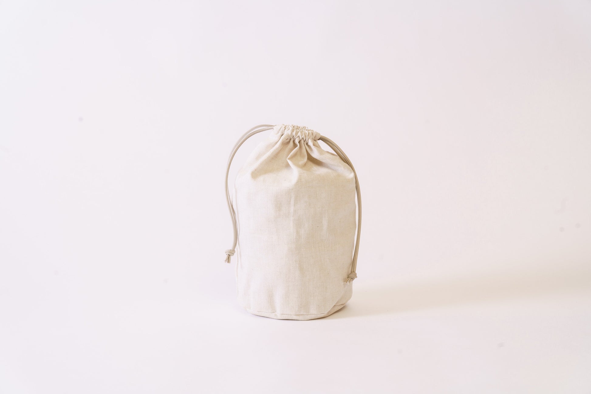 インナーの巾着は現在、リネン100%を使用、巾着についている革紐も